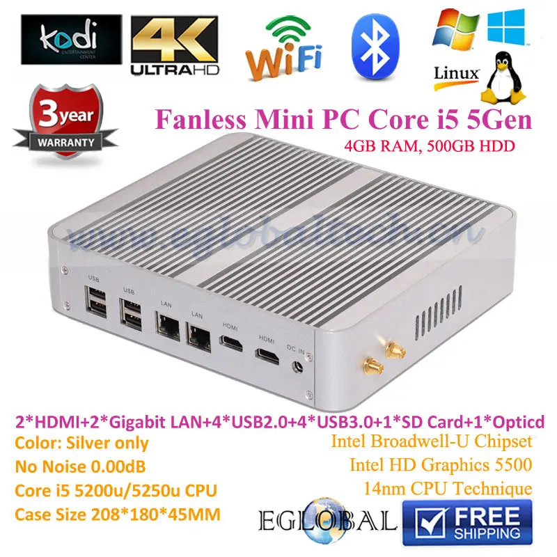 Main Features : 3 Years Warranty Super Mini PC Windows Core i5 5257u Iris 6100 Fanless Nettop HTPC 4GB RAM 500GB HDD 2Nics Mini Computer Desktop