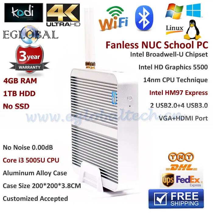 Main Features : 4G RAM 1TB HDD 300M WIFI Gigabit Mini PC Desktop Computer Fanless Broadwell Intel Nuc Core i3 5005U HD5500 Micro PC Linux Ubuntu