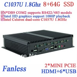 Main Features : Wide application IPC mini pc 8G RAM 64G SSD fanless INTEL Celeron C1037u 1.8 GHz VGA HDMI RJ45 usb 6*COM windows Linux