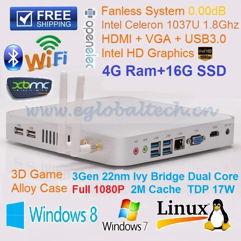 Main Features : Portable Computer Mini Desktop Fanless PC Windows 4G Ram 16G SSD Intel Celeron 1037U 1.8GHz HM 77 Chipset Intel HD Graphics 2500