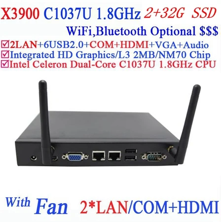 Main Features : Mini pc with fan 2*Lan HDMI COM C1037U dual core 1.8Ghz CPU 3D API support DirectX 11 Aluminium Chassis 2G RAM 32G SSD